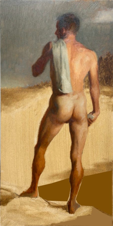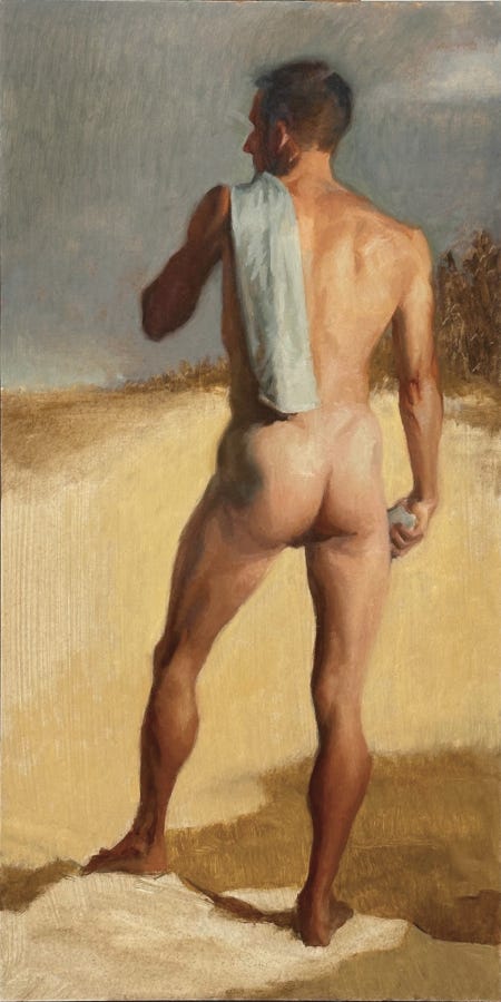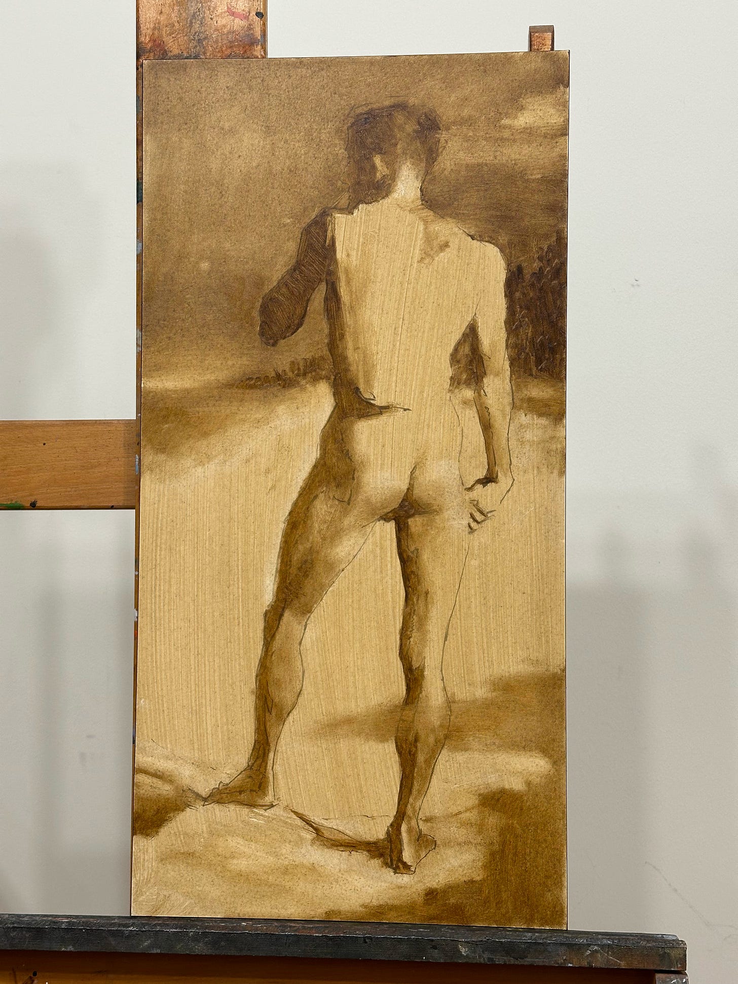 Is it done? I think it’s done enough. There’s blessed little paint on it and huge parts of the background have only the velatura but because the brunaille did the heavy lifting, most of the values were there from the get-go and it didn’t require a bunch of layers. I did this with a basic red-orange/blue palette and I want to try a more compressed pose with the classic red/green. And softer edges. This is a piece that is almost content-less, which is so much easier to do. But Larisa put a bug in my ear and I want to finish her master copy, learn how she thinks.
